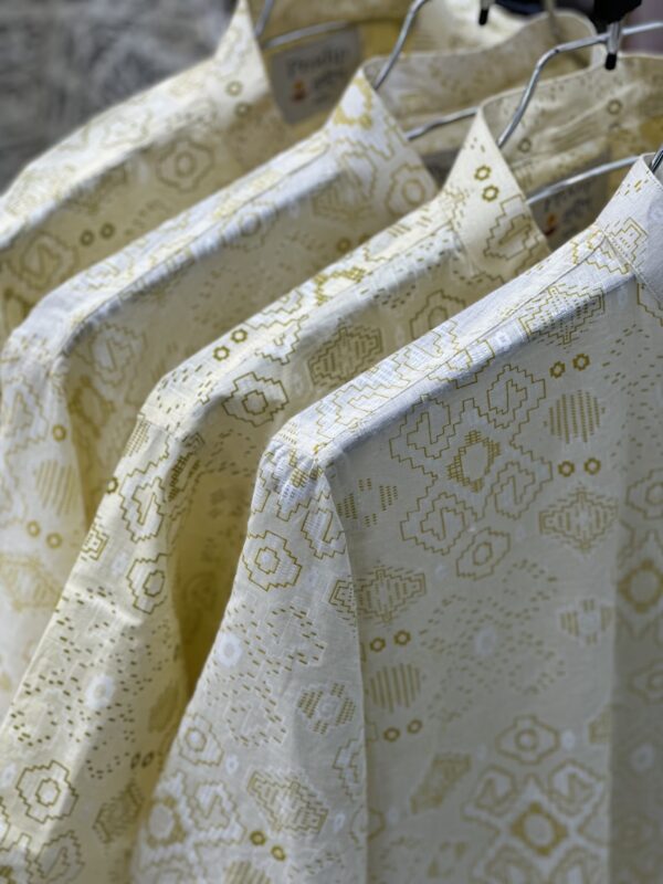 হাতে বোনা আরামদায়ক ক্রিম কালার এর মধ্যে গোল্ডেন ও সাদা কালার স্কিনপিন্টের খাদি ফতুয়া।
